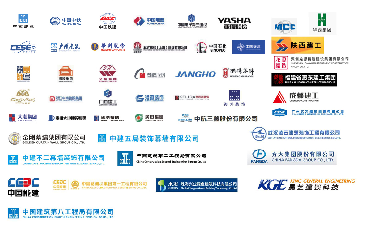 公司參建了諸多大型項(xiàng)目工程,如港珠澳大橋、珠海國際航展、深圳國際會(huì)展中心、廣州白云機(jī)場(chǎng)、西安全運(yùn)會(huì)場(chǎng)館、成都東安湖大運(yùn)會(huì)場(chǎng)館、樂山奧體中心、洛陽奧體中心、增城富士康廠房、惠州中海油、陽江核電站、珠三角各地鐵線、高鐵站、廣西桂林機(jī)場(chǎng)、廣西柳州文化廣場(chǎng)、四川成都天府機(jī)場(chǎng)、海南海口美蘭機(jī)場(chǎng)、西安絲路會(huì)展中心、惠州北站等等。與中國建筑、中國中鐵、中國鐵建、中國電建、中國交建、中國中冶、中國能建、廣東建筑、廣西建工、廣州建筑等大型國有企業(yè)下屬公司及江河幕墻、金螳螂裝飾等各大建筑裝飾、幕墻裝飾公司達(dá)成長期友好合作關(guān)系。